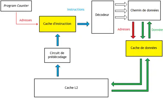 Une telle organisation facilite l'implémentation de certaines optimisations, voire rend celles-ci possibles. Citons comme exemple, la technique dite du prédécodage. Pour accélérer le décodage des instructions, certains concepteurs de processeurs ont décidés d'utiliser la (ou les) mémoire cache dédiée aux instructions pour accélérer ce décodage. Lorsque ces instructions sont chargées depuis la RAM ou les niveaux de cache inférieurs, celles-ci sont partiellement décodées. On peut par exemple rajouter des informations qui permettent de délimiter les instructions ou déterminer leur taille, ce qui est utile pour décoder les instructions de taille variable. Bref, le cache d'instructions peut se charger d'une partie du décodage des instructions, grâce à un circuit séparé de l'unité de décodage d'instruction.