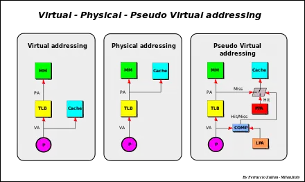 Les caches physiquement tagués sont moins rapides que les caches virtuellement adressés. Pourtant, les caches virtuellement tagués sont peu fréquents sur les processeurs modernes. Et la raison est assez intéressante : c'est une question d'adresses homonymes et synonymes.