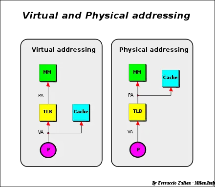 La manière d'accéder à un cache dépend de s'il est virtuellement ou physiquement tagué. Il faut utiliser l'adresse virtuelle pour les premiers, physique pour les seconds.