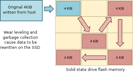 De nombreux phénomènes font que les écritures sont multipliées sur les SSD, c’est-à-dire qu'il arrive qu'une écriture demandée par le système d'exploitation se traduise par plusieurs écritures à l'intérieur du SSD. Ce phénomène d'amplification d'écriture a plusieurs causes. Déjà, le wear leveling ajoute des écritures supplémentaires en déplaçant des blocs. Mais le responsable principal est l'optimisation de réassignement lors de l'écriture, vue plus haut. Avec elle, chaque écriture se fait dans une nouvelle page, ce qui gaspille le bloc/la page qui contient l'ancienne version de la donnée écrite. Si un secteur est écrit six fois de suite, six blocs ou six pages seront utilisés pour mémoriser ce secteur dont un seul contiendra une donnée valide : ce qui fait un gâchis de cinq blocs/pages. Un SSD tomberait rapidement à court de pages si les constructeurs n'avaient pas déjà pris la mesure du problème. Mais évidemment, les SSDs contiennent de nombreuses méthodes pour limiter la casse.