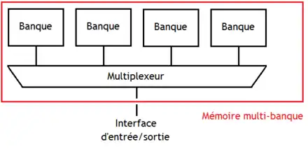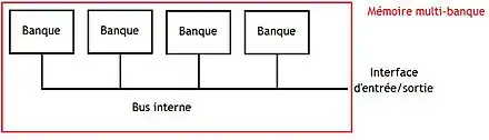 Sur certaines puces mémoires, un seul boitier peut contenir plusieurs mémoires indépendantes regroupées pour former une mémoire unique plus grosse. Chaque sous-mémoire indépendante est appelée une banque, ou encore un banc mémoire. La mémoire obtenue par combinaison de plusieurs banques est appelée une mémoire multi-banques. Cette technique peut servir à améliorer les performances, la consommation d'énergie, et j'en passe. Par exemple, cela permet de faciliter le rafraichissement d'une mémoire DRAM : on peut rafraichir chaque sous-mémoire en parallèle, indépendamment des autres. Mais cette technique est principalement utilisée pour doubler le nombre d'adresses, doubler la taille d'un mot mémoire, ou faire les deux.