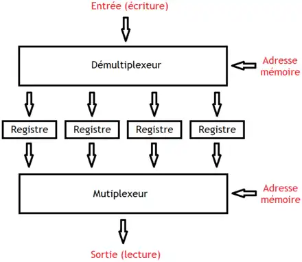 Les mémoires multiport les plus simples sont les mémoires double port, avec un port de lecture et un d'écriture. Il suffit de prendre des cellules à double port, avec un port de lecture et un d'écriture. Il suffit de connecter la sortie de lecture à un multiplexeur, et l'entrée d'écriture à un démultiplexeur.