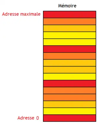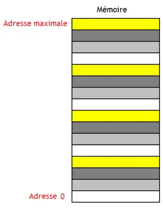 Sans la technique dite de l'entrelacement, qu'on verra dans la section suivante, on utilise les bits de poids forts pour sélectionner la banque, ce qui fait que les adresses sont réparties comme illustré dans le schéma ci-dessous. Un défaut de cette organisation est que, si on souhaite lire/écrire deux mots mémoires consécutifs, on devra attendre que l'accès au premier mot soit fini avant de pouvoir accéder au suivant (vu que ceux-ci sont dans la même banque).