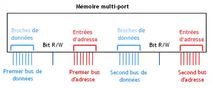 Les mémoires multiports sont reliées non pas à un, mais à plusieurs bus. Chaque bus est connecté sur la mémoire sur ce qu'on appelle un port. Ces mémoires permettent de transférer plusieurs données à la fois, une par port. Le débit est sont donc supérieur à celui des mémoires mono-port. De plus, chaque port peut être relié à des composants différents, ce qui permet de partager une mémoire entre plusieurs composants. Comme autre exemple, certaines mémoires multiports ont un bus sur lequel on ne peut que lire une donnée, et un autre sur lequel on ne peut qu'écrire.