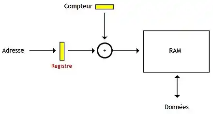Pour les accès en rafale linéaire, le compteur est séparé de ce registre. Ce compteur est initialisé à 0 lors de la transmission d'une adresse, mais est incrémenté à chaque cycle sinon. L'adresse à lire/écrire à chaque cycle se calcule en additionnant l'adresse de départ, mémorisée dans le registre, au contenu du compteur. Pour les accès en rafale entrelacés, c'est la même chose, sauf que l'opération effectuée entre l'adresse de départ et le compteur n'est pas une addition, mais une opération XOR bit à bit.