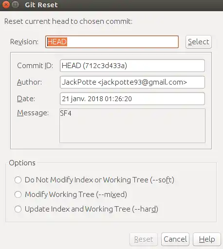 - soft : ne touche pas à l'index ni au répertoire de travail. Les fichiers en reset retournent juste de la liste des commités à celle à commiter.