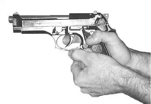 Pour prendre une arme, utiliser d'abord seulement la main droite. Ne pas d'emblée placer de doigt dans le pontet. L'arrière de la poignée est bien calé. Le pouce est sur la gauche de la poignée, aussi haut que possible et dirigé dans l'axe du tir. La main gauche enveloppe l'autre. TOUT (main, doigts...) doit rester SOUS le niveau de la culasse. La prise est très ferme (un étau!).