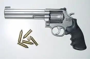 Le revolver a un barillet basculant latéralement ou vers l'avant, à X chambres (trous) donc X coups (souvent 6). On bascule le barillet afin de le charger en plaçant une munition dans chaque chambre.