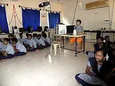 ![]() Fig. 4.8. Classe d'informatique dans la Higher Secondary School du village de Kuilappalayam en Inde lors d'une présentation du mouvement Wikimédia (source : https://w.wiki/4VGz). |