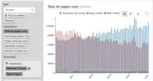 Comme le contenu des projets Wikimédia est principalement diffusé sur le Web, ses lecteurs sont donc fatalement des personnes qui bénéficient d'un accès au réseau Internet. On peut accéder au site développé par le mouvement depuis un ordinateur de bureau, mais également, comme cela devient de plus en plus fréquent, par l'intermédiaire d'appareils mobiles tels que tablette ou smartphone. En consultant le site Wikistats, on observe au niveau mondial, que dès 2018, la consultation des projets Wikimédia au départ d'appareils mobiles a dépassé celle des ordinateurs de bureau (figure 4.2). Au niveau du projet Wikipédia en français[N 3], on observe aussi que l'usage d'ordinateur de bureau se fait plus rare durant les week-ends, en même temps que l'usage du Web mobile augmente en proportion inverse (figure 4.3.). En moyenne, trois cinquièmes des connexions au projet Wikipédia en français et trois quarts en période de week-end, se font au départ d'un appareil mobile. Cependant, lorsque l'on sait que 93 % des modifications apportées à l'encyclopédie se font au départ d'un ordinateur de bureau[S 1], on comprend que les appareils mobiles sont principalement utilisés comme outils de lecture et non d'édition.