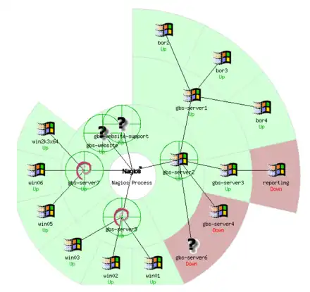 Nagios s'installe assez facilement pour surveiller, archiver et représenter les périodes où les machines sont en ligne, leurs services sont lancés et leurs ressources disponibles[1] :