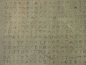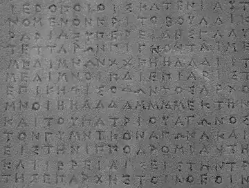 RemarquesOn peut constater à la ligne 8 la présence de « ΔΔΔΔΜΜΜΜ ». Comme ce texte est le compte des trésoriers de Déméter et de Korè, et comme cet ensemble est imprononçable, on peut facilement conclure qu'il s'agit de chiffres écrits en numération acrophonique. Pour rappel, Δ vaut 10 et Μ vaut 10 000. Pour obtenir la valeur de ce chiffre, on fait donc 10+10+10+10+10000+10000+10000+10000+10000=40040.