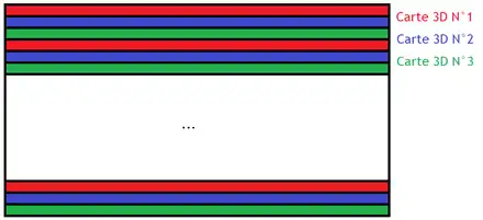 Historiquement, la première technique multi-GPU inventée s'appelait le Scan Line Interleave et elle fût utilisée par les cartes graphiques Voodoo 2. Avec cette technique, chaque carte graphique calculait une ligne sur deux, la première carte rendait les lignes paires et l'autre les lignes impaires. Notons que cette technique ressemble à la technique de l'entrelacement vue dans le tout premier chapitre. Cependant, on peut adapter la technique à un nombre arbitraire de GPU, en faisant calculer par chaque GPU une ligne sur 3, 4, 5, etc.