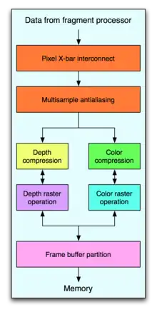 Un ROP est typiquement organisé comme illustré ci-contre. Il récupère les fragments calculés par les pixels shaders et/ou les unités de texture, via un circuit d'interconnexion spécialisé. Chaque ROP est connecté à toutes les unités de shader, même si la connexion n'est pas forcément directe. Toute unité de shader peut envoyer des pixels à n'importe quel ROP. Les circuits d'interconnexion sont généralement des réseaux d'interconnexion de type crossbar, comme illustré ci-contre (le premier rectangle rouge). Le ROP gère aussi l'antialiasing, de concert avec l'unité de rastérisation. Ensuite, les ROP contiennent des circuits pour gérer la profondeur des fragments et déterminer quel fragment est devant l'autre. Ils contiennent aussi des circuits pour calculer la couleur finale des pixels, ce qui revient à gérer la transparence des fragments. Le tout est suivi d'une unité qui enregistre le résultat final en mémoire.