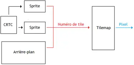 Le matériel des anciennes cartes 2D était optimisé pour gérer les tiles. Son rôle était de reconstituer l'image finale en plusieurs étapes. Le tile set était généralement mémorisé dans une mémoire à part, il était parfois dans la mémoire ROM de la cartouche, mais il était parfois recopié dans une mémoire RAM intégrée dans la carte graphique pour plus de rapidité. Les registres pour les sprites et la RAM de l'arrière-plan étaient remplis de numéros de tiles et non directement de pixels. Le matériel rendait les sprites en lisant la tile adéquate, automatiquement. D'abord les circuits d'adressage lisaient les mémoires pour l'arrière-plan et les sprites, et récupéraient un numéro de tile. La tile correspondant était lue depuis la tilemap, dans une autre mémoire. Enfin, divers circuits choisissaient le pixel adéquat dans la tile à chaque cycle d'horloge.