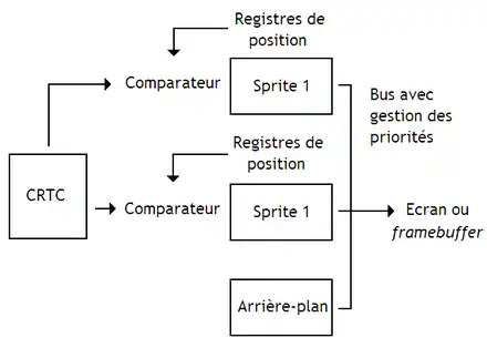 Pour chaque sprite, on trouve deux registres permettant de mémoriser la position du sprite à l'écran : un pour sa coordonnée X, un autre pour sa coordonnée Y. Lorsque le CRTC demande à afficher le pixel à la position (X , Y), chaque triplet de registres de position est comparé à la position X,Y fournie par le CRTC. Si aucun sprite ne correspond, les mémoires des sprites sont déconnectées du bus et le pixel affiché est celui de l'arrière-plan. Dans le cas contraire, la RAM du sprite est connectée sur le bus et son contenu est envoyé au RAMDAC.
