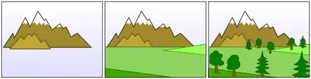 La base d'un rendu en 2D est de superposer des images 2D pré-calculées les unes au-dessus des autres. Par exemple, on peut avoir une image pour l’arrière-plan (le décor), une image pour le monstre qui vous fonce dessus, une image pour le dessin de votre personnage, etc. On distingue généralement l'image pour l'arrière-plan, qui prend tout l'écran, des images plus petites qu'on superpose dessus et qui sont appelées des sprites. Le rendu des sprites doit s'effectuer de l'image la plus profonde (l'arrière-plan), vers les plus proches (les sprites qui se superposent sur les autres) : on parle d'algorithme du peintre.