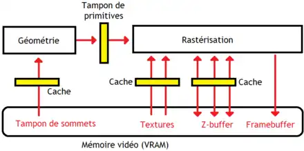 Avec les cartes graphiques en mode immédiat, l'unité géométrique envoie ses résultats à l'unité de rastérisation, sans passer par la mémoire. Et là, un premier problème survient. Un triangle dans une scène 3D correspond généralement à plusieurs pixels. Ce qui fait qu'il y a un déséquilibre entre géométrie et rastérisation : la rastérisation prend plus de temps de calcul que la géométrie. Une conséquence est qu'il arrive fréquemment que le circuit de rastérisation soit occupé, alors que l'unité de géométrie veut lui envoyer des données. Dans ce cas, on doit mettre en attente les résultats géométriques dans une mémoire tampon, appelé le tampon de primitives. De plus, la gestion de la rastérisation demande d'utiliser des informations assez lourdes, qui sont mémorisées en mémoire vidéo, comme le z-buffer dont nous parlerons à la fin du cours.