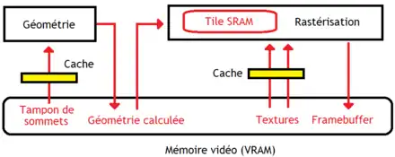 Avec les cartes graphiques en rendu à tiles, les choses sont totalement différentes. Premièrement, l'unité géométrique n'envoie pas ses résultats au rastériseur, mais mémorise le tout en mémoire vidéo. Plus précisément, les résultats sont enregistrés tile par tile. Le rastériseur lit alors la géométrie d'une tile depuis la mémoire vidéo, et la rastérise. L'avantage est que la tile est tellement petite qu'elle est intégralement rastérisée sans avoir à passer par la mémoire vidéo. En effet, le rastériseur incorpore une petite mémoire SRAM qui mémorise la tile et toutes les informations nécessaires pour effectuer le rendu. Pas besoin d’accéder à un gigantesque z-buffer pour toute l'image, juste besoin d'un z-buffer minuscule pour la tile en cours de traitement, qui tient totalement dans la SRAM pour la tile.