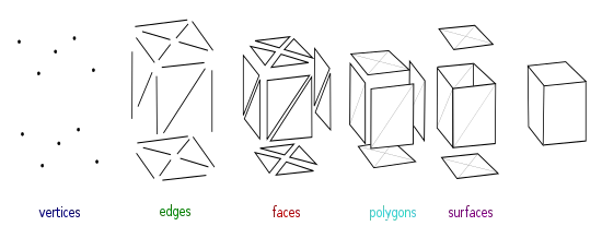 Les modèles 3D sont définis par leurs sommets, aussi appelés vertices dans le domaine du rendu 3D. Chaque sommet possède trois coordonnées, qui indiquent sa position dans la scène 3D : abscisse, ordonnée, profondeur. Un triangle est donc composé de 9 coordonnées, 3 par sommet. Ensuite, les sommets sont reliés entre eux. Un segment qui connecte une paire de sommets s'appelle une arête, comme en géométrie élémentaire. Si plusieurs arêtes délimitent une surface fermée, celle-ci est appelée une face, ou encore une primitive. Je le répète, mais les seules faces actuellement utilisées en rendu 3D sont les triangles. Quand plusieurs faces sont sur un même plan, elles forment un "polygone", bien que le terme ne soit utilisé comme en mathématique. Un assemblage de plusieurs "polygones" donne une surface. Dans la suite du cours, nous parlerons surtout des sommets et des primitives.