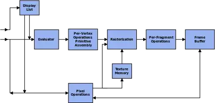 Pour donner un exemple, je vais prendre l'exemple d'OpenGL 1.0, une des premières version d'OpenGL, aujourd'hui totalement obsolète. Le pipeline décrit par penGL 1.0 est illustré ci-dessous. On voit qu'il implémente le pipeline graphique de base, avec une phase de traitement de la géométrie (per vertex operations et primitive assembly), la rastérisation, et les traitements sur les pixels (per fragment opertaions). On y voit la présence du framebuffer et de la mémoire dédiée aux textures, les deux étant soit séparées, soit placée dans la même mémoire vidéo. La display list est une liste de commande de rendu que la carte graphique doit traiter d'un seul bloc, chaque display list correspond au rendu d'une image, pour simplifier. Les étapes evaluator et pixel operations sont des étapes facultatives, qui ne sont pas dans le pipeline graphique de base, mais qui sont utiles pour implémenter certains effets graphiques.