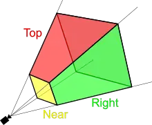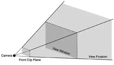 Ce qui est potentiellement visible du point de vue de la caméra est localisé dans un volume, situé entre le plan de l'écran et le plan limite, appelé le view frustum. Suivant la perspective utilisée, ce volume n'a pas la même forme. Avec la perspective usuelle, le view frustum ressemble à un trapèze en trois dimensions, délimité par plusieurs faces attachées au bords de l'écran et au plan limite. Le tout est parfois appelée, bien que par abus de langage, la pyramide de vision. Avec d'autres perspectives moins utilisées, le view frustum est un pavé, mais nous n'en parlerons pas plus dans le cadre de ce cours car elles ne sont presque pas utilisés dans les jeux vidéos actuels.