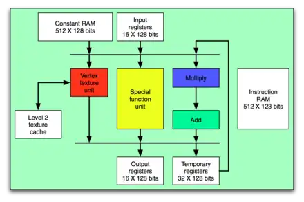 Mais pour les unités de calculs des processeurs de shaders, ce n'est pas le cas. Les instructions de calcul arithmétiques sont nécessaires, mais le gros du travail demande d'effectuer des opérations complexes. Il faut dire que le rendu 3D demande pas mal de calculs trigonométriques, de produits scalaires ou d'autres opérations. Aussi, les processeurs de shaders disposent souvent d'une unité de calcul spécialisée dans les calculs complexes (exponentielle/logarithme, racine carrée, racine carrée inverse, autres), parfois de plusieurs. De plus, on trouve souvent une unité de calcul spécialisée dans l’opération Multiply-And-Add (une multiplication suivie d'une addition, opération très courante en 3D, notamment dans le calcul de produits scalaires). Un bon exemple est le processeur de vertex shader de la Geforce 6800, illustré ci-dessous. On voit que le processeur contient une unité d'accès mémoire pour lire les textures, avec deux unités de calcul : une unité pour les opérations mathématiques complexes et une unité pour le calcul Multiply-And-Add. On voit que les unités de calculs sont assez spécialisées, avec une ou plusieurs unités généralistes, secondée par des unités capables de faire des calculs spécialisés.