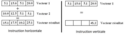 Les instructions des processeurs SIMD manipulent plusieurs nombres en même temps. Elles manipulent plus précisément des vecteurs, des ensembles de plusieurs nombres entiers ou nombres flottants placés les uns à côté des autres, le tout ayant une taille fixe. Une instruction SIMD traite chaque données du vecteur indépendamment des autres. Par exemple, une instruction d'addition vectorielle va additionner ensemble les données qui sont à la même place dans deux vecteurs, et placer le résultat dans un autre vecteur, à la même place. Quand on exécute une instruction sur un vecteur, les données présentes dans ce vecteur sont traitées simultanément.