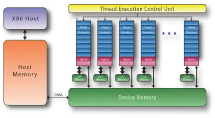 Les différentes mémoires inclues dans le processeur sont en bleu. Elles regroupent un cache d'instruction, un banc de registres (register file) qui contient les registres du processeur, et divers caches (en bas) reliés au reste du processeur par un réseau d’interconnexion (interconnect network). En orange se trouve les circuits de contrôle, qui ont pour but de décoder et de répartir les instructions sur les unités de calculs plus bas. Ils regroupent l'unité de décodage des instructions (non-représentée), des warp scheduler et les unités de dispatch qui s'occupent de la répartition des calculs sur les unités de calcul. Enfin, en vert, on a diverses unités de calcul. Les unités core ne sont pas des cœurs de processeurs, comme la terminologie utilisée par NVIDIA peut le faire croire, mais des unités de calcul arithmétiques simples, capables de faire additions, multiplications, et quelques autres calculs du genre. Les unités LD/ST sont les unités pour l'accès à la mémoire et elles sont capables d'accèder à des textures et de les filtrer. Enfin, les unités SFU sont des unités de calculs spécialisées dans les calculs complexes, trigonométriques ou autres.