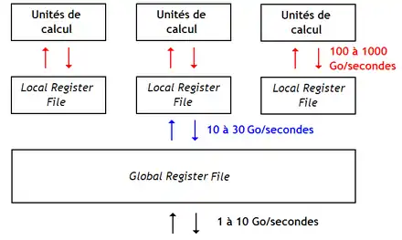 On peut se demander pourquoi utiliser plusieurs couches de registres ? Le fait est que les processeurs de flux disposent d'une grande quantité d'unités de calcul. Et cela peut facilement aller à plus d'une centaine ou d'un millier d'ALU ! Si on devait relier toutes cas unités de calcul à un gros banc de registres, celui-ci serait énorme, lent, et qui chaufferait beaucoup trop. Pour garder un banc de registres rapide et pratique, on est obligé de limiter le nombre d'unités de calcul connectées dessus, ainsi que le nombre de registres contenus dans le banc de registres. La solution est donc de casser notre gros banc de registres en plusieurs plus petits, reliés à un banc de registres plus gros, capable de communiquer avec la mémoire. Ainsi, nos unités de calcul vont aller lire ou écrire dans un banc de registres local très rapide.