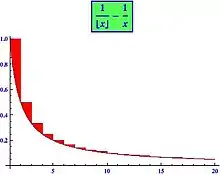 Si on fait la différence entre la fonction et la suite qui correspond à la fonction , on obtient le graphe si-contre. L'aire sous la courbe de 1/X est égale à , alors que l'aire sous la courbe de la suite harmonique est égale à . La différence entre les deux est l'aire coloriée en rouge. Plus on augmente le rang n, plus l'aire bleue converge vers la constante d'Euler-Mascheroni .
