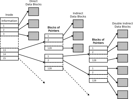 Une autre méthode consiste à ne pas stocker les correspondances (cluster -> cluster suivant), mais simplement les adresses des clusters les unes à la suite des autres : on obtient ainsi un i-nœud. C'est cette méthode qui est utilisée dans les systèmes d'exploitation UNIX et leurs dérivés (Linux, notamment). Sous Linux, la table des adresses de cluster a cependant une taille limitée. Pour gérer des fichiers de taille arbitraire, il est possible d'utiliser plusieurs tables d'i-nœuds par fichier. Ces tables sont reliées sous la forme d'une liste chaînée, chaque table d'i-nœud indiquant la suivante. Dans certains cas extrêmes, cette organisation en liste chaînée disparaît au profit d'une organisation partiellement arborescente, certaines tables contenant plusieurs pointeurs vers les tables suivantes (tables doublement indirectes).