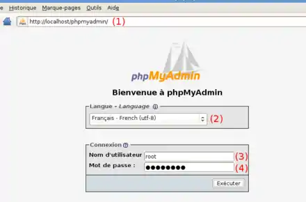 Une fois les paquets téléchargés et installés, taper http://localhost/phpmyadmin/ dans la barre d'adresse d'un navigateur (1) et faire "Entrée". Une page s'affichera, invitant à choisir sa langue d'affichage (2), entrer son nom utilisateur (3, sinon il définit phpmyadmin par défaut) et son mot de passe (4). Valider avec le bouton "Exécuter"