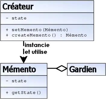 Le patron de conception Mémento peut être représenté par le diagramme de classes UML suivant :