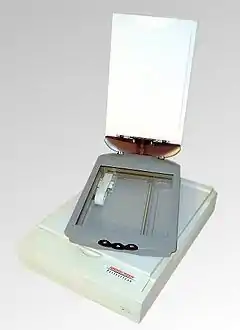 Dans les scanners à défilement, le document est entraîné par des rouleaux et défile devant le capteur, comme dans un fax. Ces appareils avant tout destinés à la bureautique, ils n'acceptent que des feuilles volantes de format standard et de faible « grammage » et présentent peu d'intérêt pour les photographes. Ils sont souvent intégrés à des combinés comportant également téléphone, fax et imprimante. |