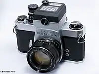 Cet appareil Pentax est équipé d'une cellule amovible construite en collaboration avec Honeywell et couplée au barillet des vitesses. La mesure se fait à travers la petite fenêtre ronde qui se trouve sur la face frontale de cet accessoire, et non à travers l'objectif. Aucune indication n'est visible dans le viseur lors de la prose de vue. |