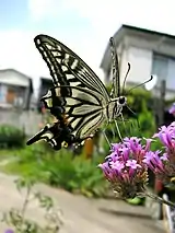 Plan rapproché d'un papillon non identifié sur une fleur :