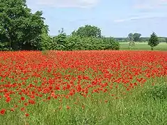 Ce paysage n'est pas inintéressant mais l'absence de vision binoculaire le rend relativement « plat ». La haie, en particulier, semble plus ou moins posée sur le champ de coquelicots et seules nos habitudes de perception de l'espace peuvent nous donner une information sur l'étendue en profondeur de la scène. |