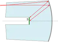 On voit ci-dessous un miroir sphérique concave muni d'un diaphragme de petit diamètre au niveau de son centre O. Tous les faisceaux lumineux qui pénètrent par le diaphragme se réfléchissent exactement de la même manière, ce qui est un avantage considérable par rapport aux lentilles qui présentent de nombreux défauts liés à l'asymétrie des faisceaux. Il n'y a donc pas d'aberration particulière liée à l'inclinaison des rayons lumineux par rapport à l'axe optique. En revanche, il y a autant de foyers tels que F ou F' que de faisceaux de rayons parallèles pouvant pénétrer par le diaphragme, et tous ces foyers constituent une surface focale sphérique, dont le rayon est la moitié de celui du miroir.