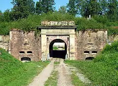 Batterie de Sanchey Un bon document d'architecture, montré de façon presque symétrique. L'aspect de visages tristes des deux ouvertures bouchées de chaque côté de la porte a-t-il été recherché délibérément par les architectes ? |