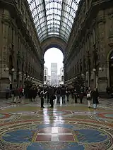 Galerie Victor Emmanuel II Cette perspective n'est pas tout-à-fait frontale, le point principal est un peu plus bas que le centre du rectangle et les verticales ne sont pas tout-à-fait parallèles. Une photo bien réussie où se conjugue l'intérêt documentaire et l'ambiance de vie très animée. Remarquer à nouveau les têtes dans le plan d'horizon. |