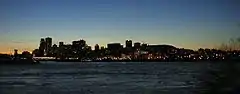 Montréal la nuit C'est ici le cas typique d'une photo faite trop tôt, les lumières de la ville ne font pas le poids par rapport à la lumière du jour et les bâtiments forment une masse sombre peu agréable. |