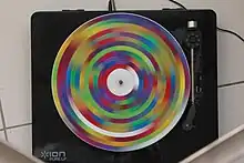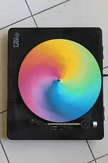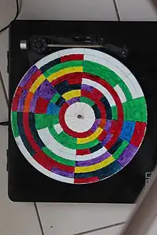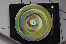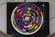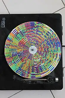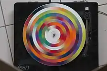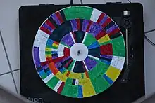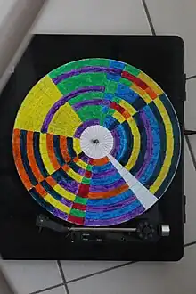 ![]() Spirales sextuples sur un intervalle de 30 degrés avec 6 couleurs peintes sur vinyle à l'arrêt du tourne disque |