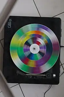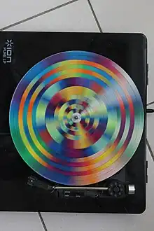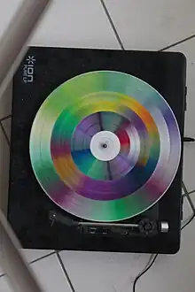| Synthèse additive par lumière réfléchie sur un disque à 45 tr/min | Couleurs sur un disque à l'arrêt pour une synthèse additive par lumière réfléchie |