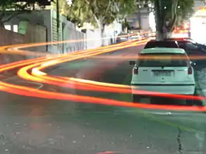 Ici le temps de pose atteint 20 s, il ne reste plus des automobiles que les traces de leurs feux de signalisation, tout se passe comme si les éléments en mouvement étaient réduits à des fantômes transparents dont on ne perçoit plus que la trace de leurs éléments lumineux. |