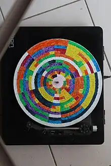 ![]() Partition du Bolero de Ravel en 10 secteurs de 12 octets sur 8 pistes | ![]() Bolero joué à 78 tours en flou stroboscopique prise à 1/13s pour 2pi/10 | ![]() Partition de Smile (temps modernes) de 72 secteurs de 4 noires sur 12 pistes | ![]() Partition de Smile (temps modernes) en mouvement angle pi/3 0.3 s 33tours/min |