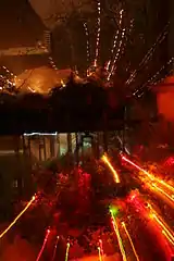Cette photographie faite avec un temps de pose relativement long et sur pied montre à la fois des éléments immobiles parfaitement nets et un manège dont les parties lumineuses ont laissé des traînées caractéristiques. |