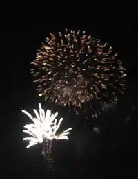 Blue Ash Community Fireworks Show, 4 juillet 2005 S'il faut en croire les données EXIF, cette photo a été faite avec une sensibilité de 100 ISO, ce qui donne à la fois une finesse certaine à l'image des traînées lumineuses et des noirs purs pour le fond sur lequel celles-ci se détachent. |