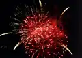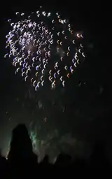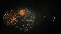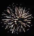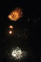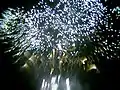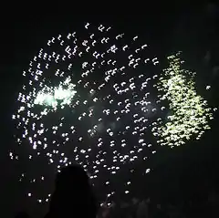 Origine inconnue Le temps de pose était ici beaucoup trop court, 1/8 s selon les données Exif, et l'appareil était manifestement tenu à la main. L'obturateur a été ouvert bien trop tard, alors que la fusée avait déjà explosé, et s'est refermé trop tôt, de sorte que les traînées de feu sont réduites à petits traits dont le tracé en « S » inversé, dû au bougé, ne permet pas de percevoir la direction. |