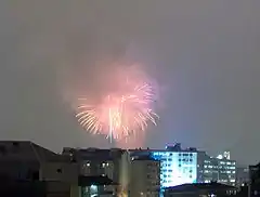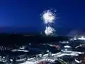 Turin 2006 Lors d'un feu d'artifice on se place parfois où l'on peut... Ce fut probablement le cas ici, le photographe a trouvé un point élevé permettant de voir les fusées tirées depuis un stade. Le décor fourni par les immeubles était tout sauf idéal et de plus la vue est en partie masquée par la fumée. |